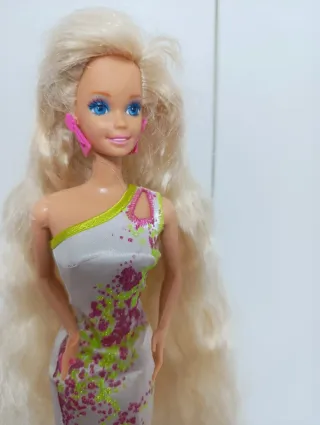 Muñeca Barbie Totally Hair. - Cabello rubio largo. - Pendientes rosas. - Vestido blanco con estampado de salpicaduras rosas y verdes.