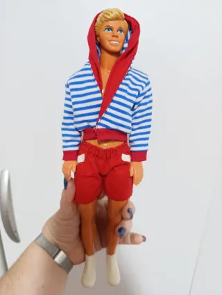 Muñeco Ken estilo Malibu. Novio de Barbie - Traje de baño rojo. - Chaqueta a rayas azules y blancas con capucha roja. - Zapatillas blancas.
