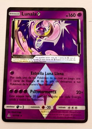 Carta Pokémon de Lunala, edición Básico. - PS: 160 - Habilidad: Estrella Luna Llena - Ataque: Psicotormenta - Debilidad: x2 - Resistencia: -20 - Coste de retirada: 3 energías - Número de carta: 62/156