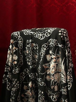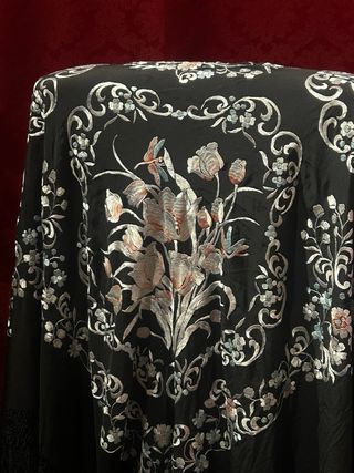 Este mantón de Manila es una pieza de gran elegancia y refinamiento, que destaca por la riqueza de su bordado artesanal y la armonía de su composición. Se trata de un mantón de fondo negro intenso, un color profundo que realza con extraordinario contraste la delicadeza de los motivos florales bordados. El negro actúa como lienzo sobrio y sofisticado, permitiendo que cada puntada cobre protagonismo y que los tonos claros del bordado resplandezcan con mayor viveza. Composición y diseño El diseño está estructurado de manera perfectamente simétrica, organizado en cuatro grandes medallones dispuestos en cuadrícula.