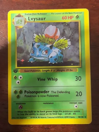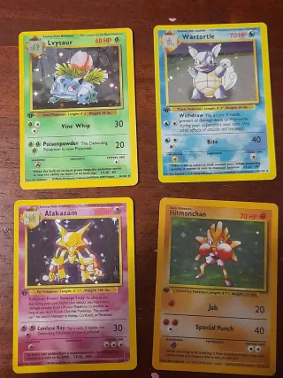 Conjunto de 4 cartas Pokémon de la colección Base Set. - Ivysaur (30/102) - Wartortle (42/102) - Alakazam (65/102) - Hitmonchan (107/102)