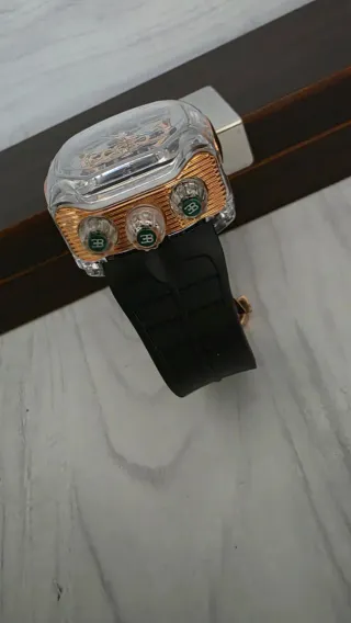 Elegante reloj con diseño transparente y detalles en tono dorado. - Caja transparente. - Bisel y detalles en color dorado. - Correa de caucho negra. - Tres coronas con logo 'BB'.