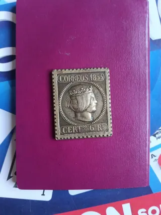 Este es un sello de bronce conmemorativo del año 1853. - Diseño detallado con perfil de personaje. - Inscripción CORREOS.1853. - Valor CERT. 6 RS.x
