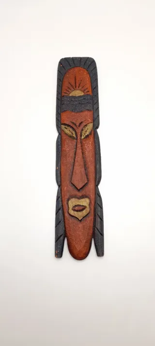Conjunto de dos máscaras tribales africanas de madera, ideales para decoración. - Diseño artesanal. - Tonos marrones y detalles en negro y dorado. - Estilo étnico. Medidas de largo 40 cm y de ancho 9cm