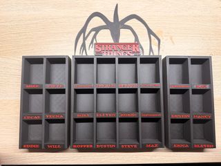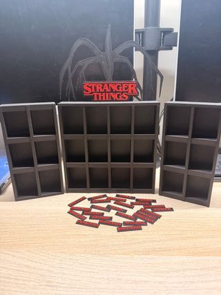 Expositor temático de Stranger Things, perfecto para coleccionistas. - Diseño inspirado en la serie. - Múltiples compartimentos para figuras o accesorios. - Incluye el logo de Stranger Things y silueta del Demogorgon.
