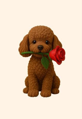 Figura decorativa de un perro con una rosa en la boca, ideal para San Valentín. - Diseño tierno y detallado. - Color marrón del perro. - Rosa roja con hoja verde.