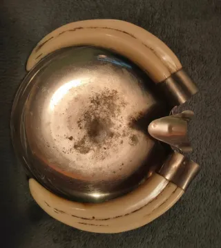 Original cenicero con un diseño inspirado en la cultura vikinga. Presenta un cuenco metálico y está adornado con lo que parecen ser defensas o colmillos. - Diseño único. - Materiales: Metal y material similar a marfil o hueso.