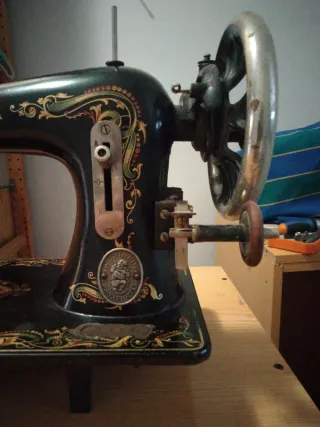 Máquina de coser antigua de la marca Wertheim, con un diseño clásico y decorativo. - Cuerpo de metal negro con detalles dorados. - Volante lateral para el movimiento manual.