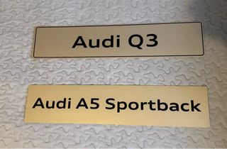 Se venden dos placas “de matrícula” con el nombre de dos vehículos Audi: el Audi Q3 y el Audi A5 Sportback. Ideales para decorar una pared o similar, para amantes de los coches de esta conocida marca alemana.