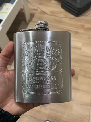 "Clase, tradición y tu whisky favorito siempre contigo." Pongo a la venta este elegante set de petaca de la mítica marca Jack Daniel's Tennessee Whiskey. Fabricada en acero inoxidable con un acabado cepillado de alta calidad, es la pieza ideal para coleccionistas o para quienes disfrutan de un trago con estilo en cualquier lugar. ¿Qué incluye este set premium? Petaca de 7oz/8oz: Con el icónico logo de Jack Daniel's grabado en relieve profundo. Tapón de rosca cautivo (¡imposible de perder!). Embudo de precisión: Para rellenarla fácilmente sin desperdiciar ni una gota. Vasito de chupito: Fabricado en acero a juego, perfecto para compartir. Caja de presentación: Interior satinado que protege y realza el conjunto. ¿Por qué elegir esta petaca? Material duradero: Acero inoxidable que no altera el sabor de la bebida. Diseño ergonómico: Curvada para adaptarse cómodamente al bolsillo de la chaqueta o el pantalón. Regalo Ideal: Es el detalle perfecto para cumpleaños, padrinos de boda o para cualquier amante del Rock & Roll y el buen Bourbon. Estado: Totalmente nueva, con los plásticos protectores originales. Nunca usada.