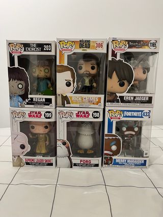 Lote de figuras Funko Pop de colecciones variadas. Rick Grimes (306), Regan (203), Eren Jaeger (1165), Supreme Leader Snoke (199), Porg (198), Merry Marauder (433)