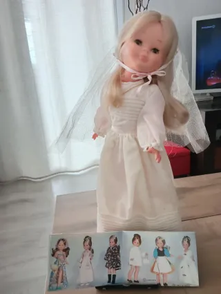 Nancy de Comunión Articulada original de Famosa (año 1977).Nunca se ha jugado con ella. Muñeca: Modelo articulado (cintura pivotante) Rostro de 1ª época con ceja de trazo único y fino. Maquillaje de origen impecable. Marcaje "Famosa Made in Spain" en la nuca baja. Vestido con etiqueta Famosa 44 y zapatos de botón central Famosa 3 Estado: No ha sido jugada, el pelo está brillante y las articulaciones solo tienen la holgura natural del paso del tiempo. El vestido está sucio de polvo y manchas amarillentas conserva su medalla metálica dorada. Se adjunta catálogo de Famosa que venía con la muñeca.