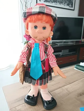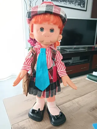 Muñeca Pinuka con su característico traje. - Gorro a cuadros. - Camisa de rayas rojas y blancas. - Corbata azul. - Falda a cuadros. - Zapatos negros. - Cartera Marrón aterciopelada ( un poco despeluchada)