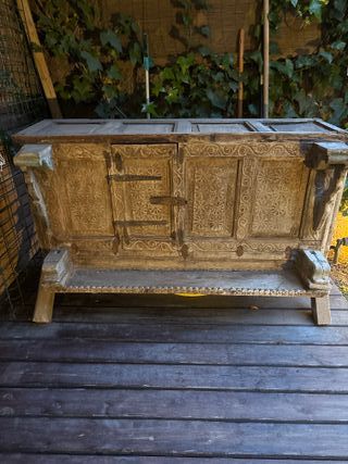 Auténtica arca de novia de la India, datada en el siglo XIX. Una pieza única con todo su material original. - Diseño tallado a mano. - Herrajes metálicos. - Estructura de madera maciza.