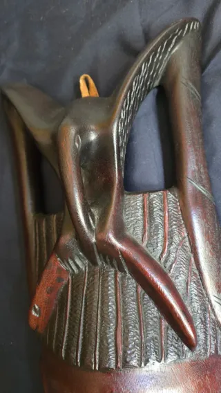 Auténtica careta africana de madera tallada a mano. Presenta un diseño tribal con detalles expresivos y un acabado en tonos rojizos y oscuros. - Elaborada en madera. - Diseño tribal. - Talla detallada. 60cm Alto 25cm Ancho