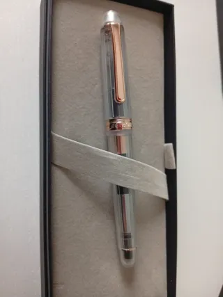 Pluma estilográfica Platinum 3776 Nice Rose Gold edición especial con plumín en oro rosa 14k y detalles en oro rosa. El cuerpo es transparente, permitiendo ver el interior. Sólo entintada una vez. - Modelo: 3776 Century Nice - Color: Transparente con detalles rosados - Incluye manual de usuario y tarjeta de garantía.