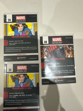 Conjunto de cartas de Marvel Anthology. Precio por unidad, negociable si te llevas varias. También si eres de bcn cercanías y tienes cartas podemos hacer cambios. Comunes - 2€ (1, 18, 37, 44, 47, 73, 100) Holo - 4€ (12, 38, 48, 74) Canvas 6€ (C1, C2) Lenticular - 6€ (L8,L6) Legacy - 6€ (Y1, Y10,Y8) Numerada a 500 - 12€ (24,24,60)
