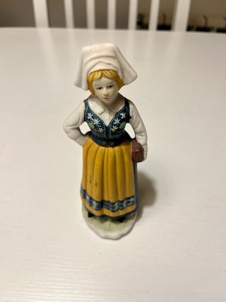 Figura decorativa de porcelana que representa a una mujer con traje regional. - Detalle de flores en el chaleco. - Falda larga amarilla. - Incluye un libro pequeño en la mano.