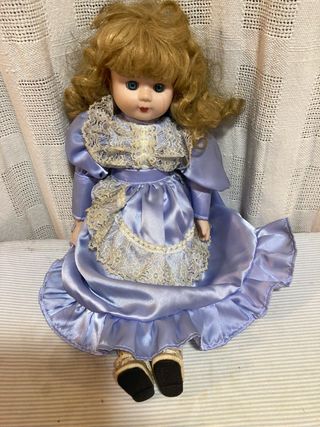 Preciosa muñeca antigua con detalles delicados. - Vestido de satén lila con encaje. - Cabello rubio rizado. - Ojos azules. - Zapatos negros con detalles plateados.