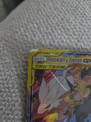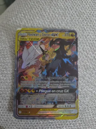 Carta Pokémon de Reshiram y Zekrom GX. - Es una carta BASIC TAG TEAM. - Tiene 270 puntos de vida (HP). - Ataque Flama Legendaria con daño base de 90. - Ataque Pliegue en cruz GX con daño base de 170. - Debilidad x2. - Resistencia. - Retirada de 3 energías. - Ilustración de Nouki Saito. - Número de carta 157/236. - Copyright 2020 Pokémon.