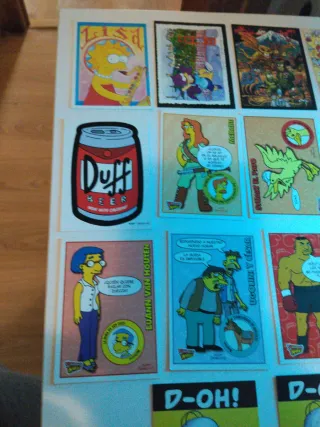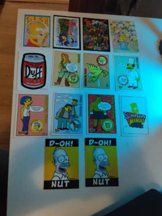 Colección de cartas Panini de Los Simpsons. Incluye varias láminas con personajes y escenas icónicas. - Lámina de Lisa Simpson tocando el saxofón. - Lámina de Duff Beer. - Lámina de Luann Van Houten. - Lámina de Stuart el Pato. - Lámina de Chef Luigi. - Lámina de Homer Simpson D-OH!. - Lámina de Homer Simpson NUT.