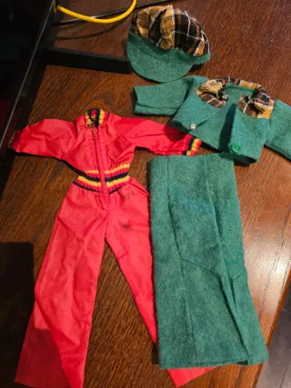 Conjunto de ropa para Nancy. - Mono rojo con cremallera y detalles de rayas. Tiene unas manchitas pierna. - Chaqueta verde con cuello y detalles a cuadros. - Pantalón verde. - Gorro a cuadros con base verde. las fotografias completan la descripcion.