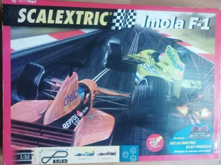 Circuito de carreras Scalextric Imola F-1. - Incluye dos coches de Fórmula 1. - Transformador con Super Power Boost. - Mandos de control electrónico. - Varios tramos de pista para configurar el circuito.