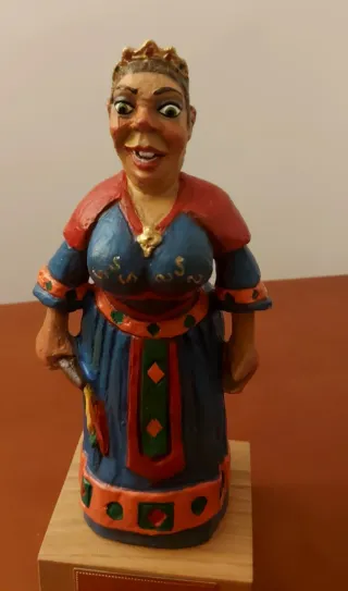Figura de resina policromada de colección Geganta Boja. 26x10 - Detalle de corona dorada. - Vestimenta con adornos. - Base de madera.