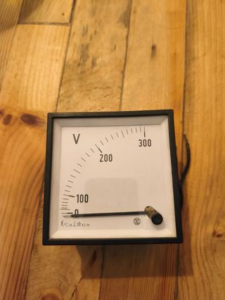 Voltímetro analógico con escala graduada. - Marco cuadrado negro. - Indicador de aguja. - Marcadores de 0, 100, 200 y 300 V.