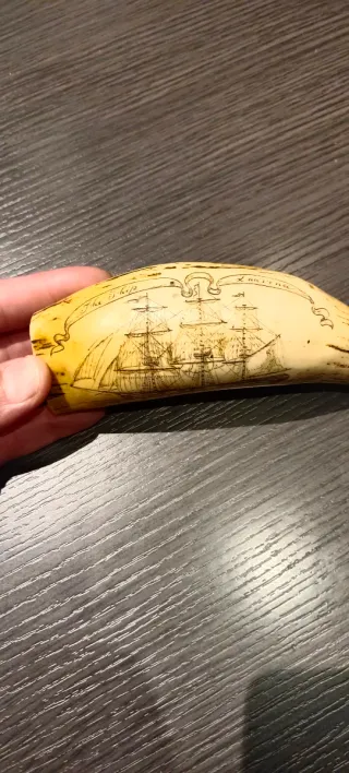 Pieza de diente de cachalote tallado con una escena marina. - Detalle de un barco de vela. - Paisaje con montañas y vegetación. - Material: Diente de cachalote.