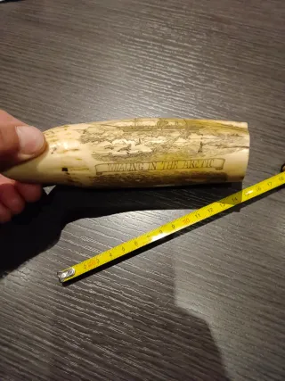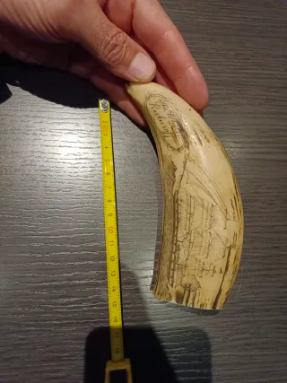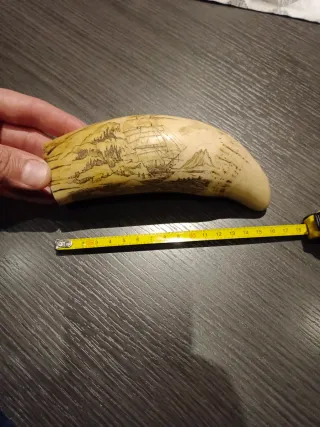 Réplica de diente de cachalote con un grabado detallado de un retrato. - Material: Resina o algo por el estilo,muy pesado...Réplica de diente de cachalote. - Diseño: Grabado de retrato. - Detalle: Motivo vegetal en la parte superior.