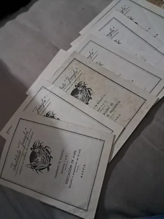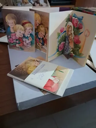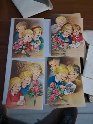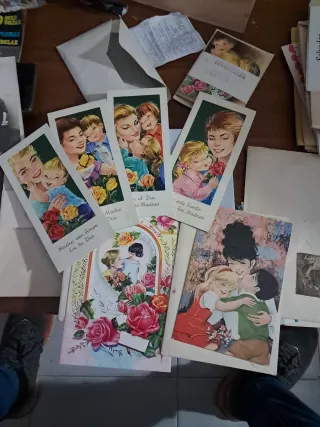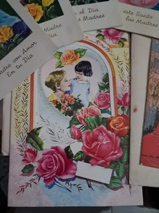 Conjunto de postales antiguas para el Día de la Madre. Presentan ilustraciones vintage de madres con sus hijos y flores. - Incluye varias postales con diferentes diseños. - Textos en español como Madre con Amor En tu Día y Feliz Día de las Madres.