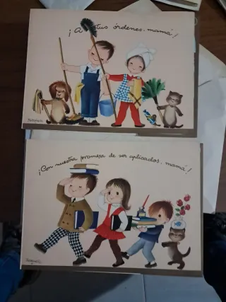 Conjunto de dos postales antiguas del Día de la Madre, ilustradas por Ferrandiz. Cada postal tiene un diseño tierno y un mensaje especial. - Ilustraciones de Ferrandiz. - Mensajes: ¡A tus órdenes, mamá! y ¡Con nuestra promesa de ser aplicados, mamá!.