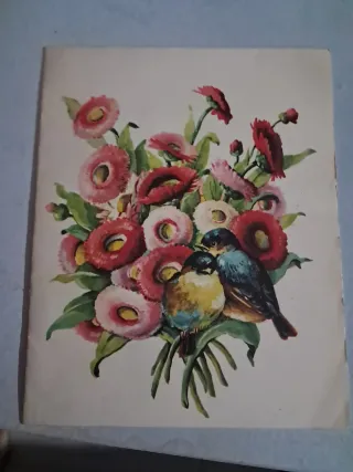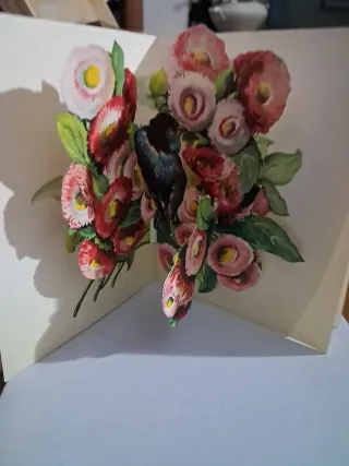 Postal de primavera con un diseño troquelado de Bamby. Presenta un bonito ramo de flores y dos pájaros. - Diseño troquelado. - Ilustración de flores y pájaros.