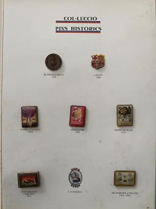 Colección de pins históricos del FC Barcelona, abarcando el periodo de 1899 a 1994. Incluye diseños emblemáticos. Están todos excepto el "Avi del Barça". - Pins conmemorativos del club. - Representaciones de escudos y eventos. - Edición especial de la revista Sport.