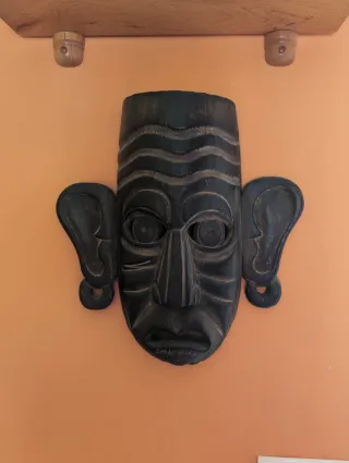 Máscara decorativa de madera tallada a mano, con un diseño tribal y expresivo. - Material: Madera. - Color: Negro. - Detalles tallados en relieve.
