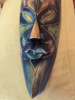 Máscara decorativa de madera con un diseño tribal y colores vibrantes. Perfecta para añadir un toque exótico a tu hogar. - Material: Madera tallada. - Acabado: Pintura artesanal con tonos verdes, azules y dorados. - Diseño: Estilo tribal con detalles en relieve.
