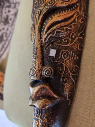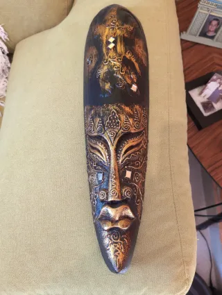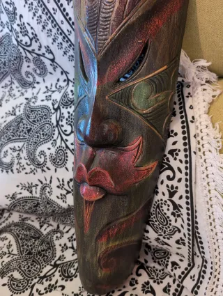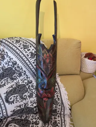 Máscara decorativa de madera con un diseño tribal. - Hecha a mano. - Pintura detallada con colores vibrantes. - Ideal para decoración de interiores.