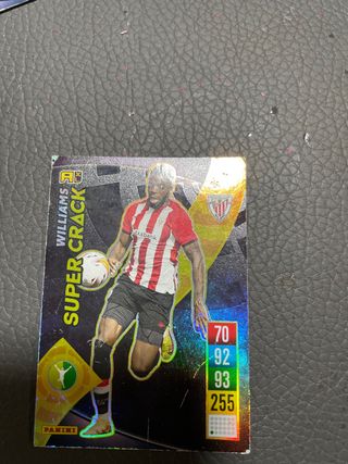 Cromo de Iñaki Williams, apodado Super Crack. - Diseño brillante y llamativo. - Incluye estadísticas del jugador: 70, 92, 93, 255. - Logo de Panini visible.