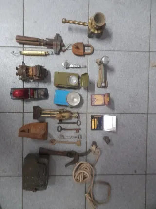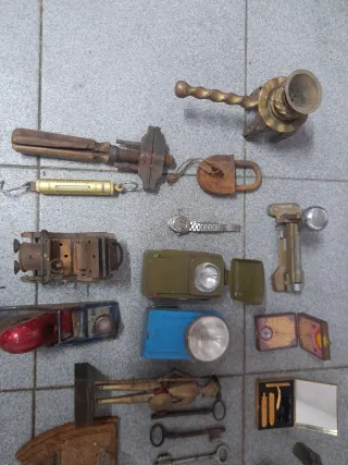 Colección de objetos antiguos y de colección. - Incluye herramientas, candados y otros elementos. - Piezas con historia y carácter.