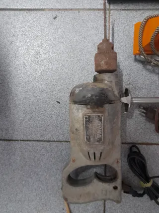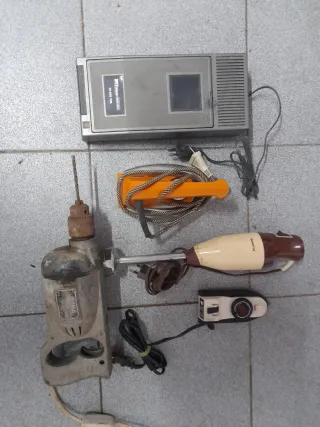 Conjunto de aparatos electrónicos antiguos. - Batidora de mano. - Dos planchas de viaje. - Taladro electrico gris, marca Dina. - Reproductor de cintas