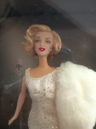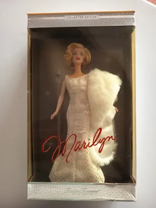 Muñeca Barbie de colección inspirada en Marilyn Monroe, edición Timeless Treasures. - Vestido largo plateado con pedrería. - Manta de pelo sintético blanco. - Firma Marilyn en rojo. La muñeca nunca se ha sacado de la caja.Destacar que la caja presenta algunas imperfecciones,debleces,ninguna rotura,y el plástico protector está un poco amarillento por el paso del tiempo