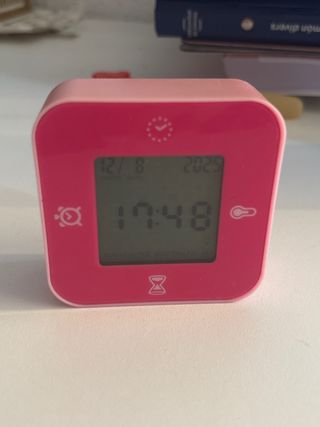 Reloj de mesilla con varias funciones útiles. - Diseño cuadrado en color rosa. - Pantalla digital. - Indicador de día de la semana.