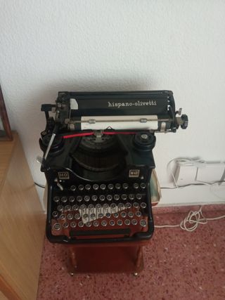 Máquina de escribir antigua Hispano Olivetti M40. - Diseño clásico en color negro. - Soporte de madera incluido.