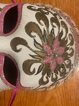 Máscara veneciana con un diseño elegante y detallado, perfecta para decoración o eventos. - Base blanca con detalles en rosa y dorado. - Adornos florales y motivos curvos. - Cinta de tela rosa para sujetar.