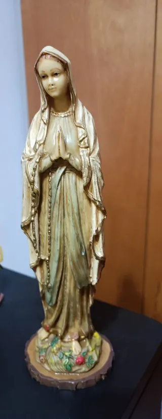Figura religiosa de la Virgen de Lourdes , con las manos juntas en oración y un rosario. Es muy antigua 23 cm - Base decorada con flores y hojas. - Tonos dorados y verdosos en el vestido. - Detalle de rosario colgando.