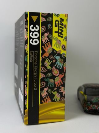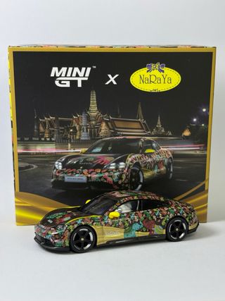 Miniatura del Porsche Taycan Turbo S de Mini GT, modelo #399. - Diseño especial NaRaYa. - Réplica detallada del coche deportivo.