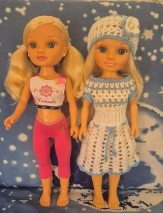 Lote de 2 muñecas nancy new 1 rubia con ojos azules, top y mallas. 1 rubia con ojos azules con vestido de ganchillo y diadema con detalle.