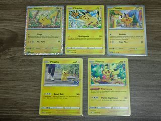 Conjunto de cinco cartas Pokémon de Pikachu. Se entregan con sleeve cada una.