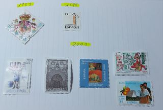 Conjunto de sellos de España de diferentes años, incluyendo motivos históricos y culturales. - Sello de 1983 con escudo nacional. - Sello de 1998 Año Santo Compostelano. - Sello de 2000 emisión "América UPAUP" - Sello de 2000 Navidad conjunta con Alemania (Nacimiento, Badajoz Wildungen.) - Sello de 2000 Iglesia de Santa María la Real. Aranda de Duero, Burgos. - Sello de 2000 Literatura española, "Entre naranjos" y "La venganza de Don Mendo". Todos los sellos son usados.